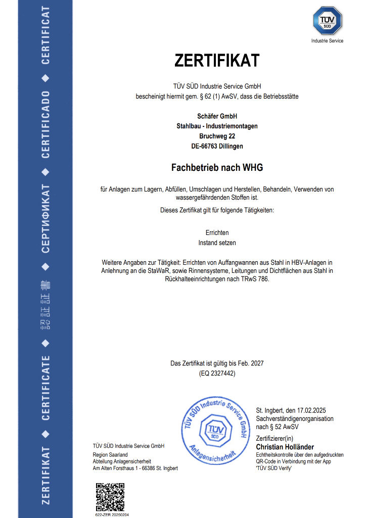 Fachbetrieb nach Wasserhaushaltsgesetz (WHG) für das Herstellen und Aufstellen von Auffangwannen aus Stahl